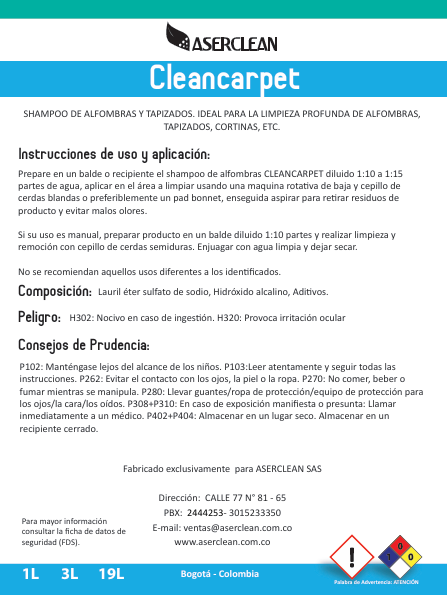 💥 ¡Cleancarpet de Aserclean es el shampoo especializado que limpia profundamente alfombras y tapizados, removiendo suciedad incrustada, ácaros y olores con espuma activa que penetra las fibras! Esta fórmula concentrada refresca textiles, ideal para salas, oficinas o hoteles en Bogotá y Colombia con tráfico alto y mascotas.