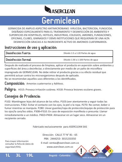 🚀 ¡Protege tus espacios con Germiclean y combínalo con nuestra línea Aserclean para desinfección integral en Colombia! Ordena ahora con envíos rápidos a Bogotá, Medellín o Cali.