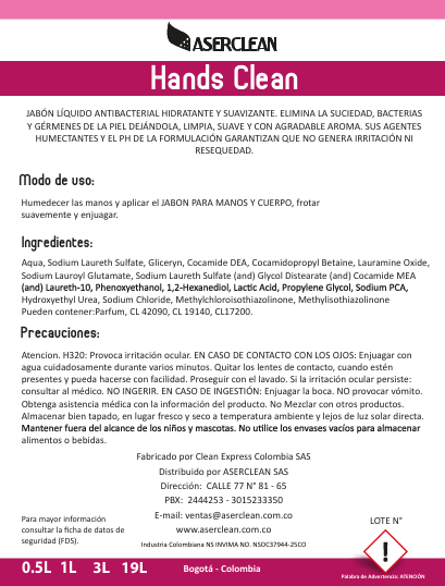 💥 ¡Hands Clean de Aserclean es el jabón líquido para manos que limpia suavemente eliminando suciedad y bacterias, con una fórmula hidratante que deja la piel fresca y sin resequedad! Esta solución concentrada es ideal para lavabos en hogares, oficinas o baños públicos en Bogotá y Colombia, promoviendo higiene diaria con espuma abundante.